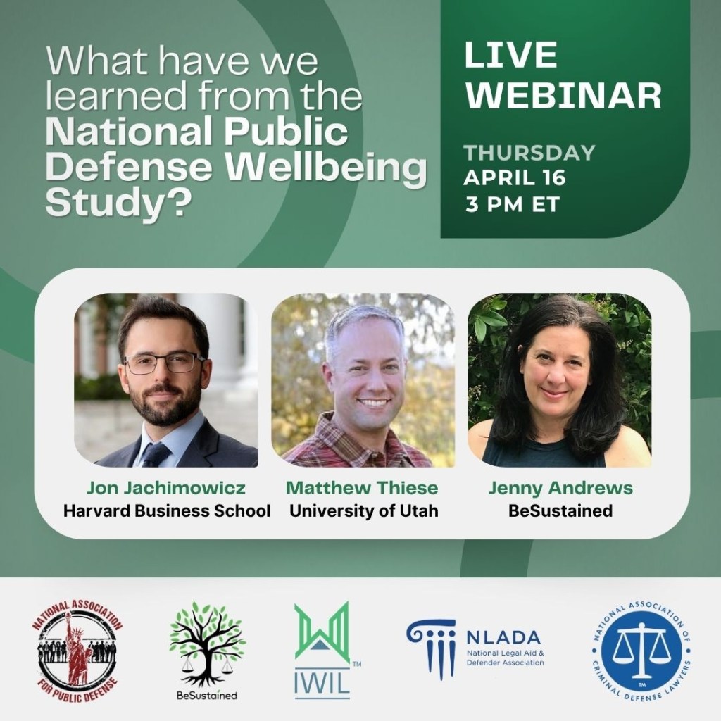 4/16/26: webinar hosted by NAPD, in collaboration with NACDL, NLADA, IWIL and BeSustained. Registration link coming soon. What Have We Learned So Far from the National Public Defense Well-Being Study? At this webinar, Harvard Business School researcher Jon Jachimowicz will share findings from a daily diary study conducted in November 2025, seeking to deepen our understanding of what drives passion, energy and sustainability in public defense. Matt Thiese, a researcher with the Rocky Mountain Center for Occupational and Environmental Health, will share plan for the upcoming survey and focus groups that will survey issues affecting public defender well-being. The findings and recommendations from this project will help support individual defenders, improve the organizations we work in, and inform the systems making budget and policy decisions that impact public defense. Register for the 4/16/26 here.